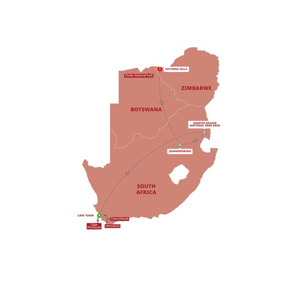 Bush, beach and two vibrant cities – capture the essence of South Africa on this culmination of a Cape Town to Kruger experience, including Johannesburg, the 'City of Gold'. Then, the power and beauty of Africa’s wilderness is revealed as you take in the thrill of Victoria Falls and visit Chobe National Park, Botswana’s home of the elephants.